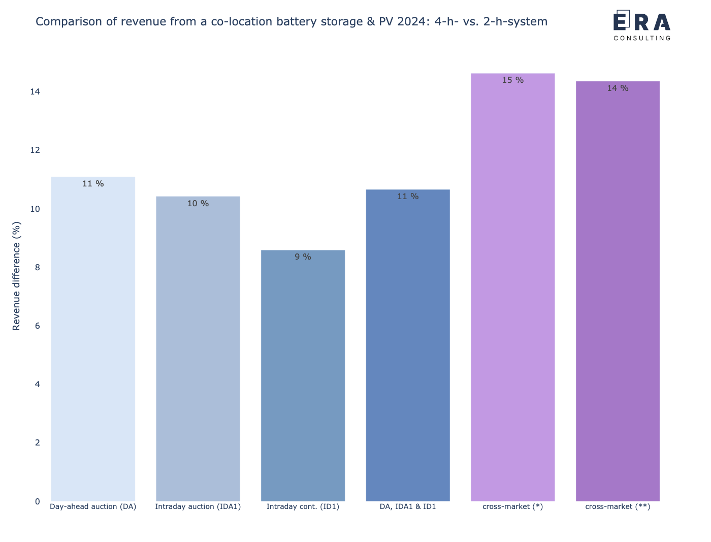 Abbildung 7: Vergleich der potenziellen gemeinsamen Erlöse eines co-location Batteriespeichers in Kombination mit einem PV-Park mit einer 2-h-Auslegung vs. 4-h-Auslegung [* durchschnittliche Leistungspreise I ** marginale Leistungspreise]