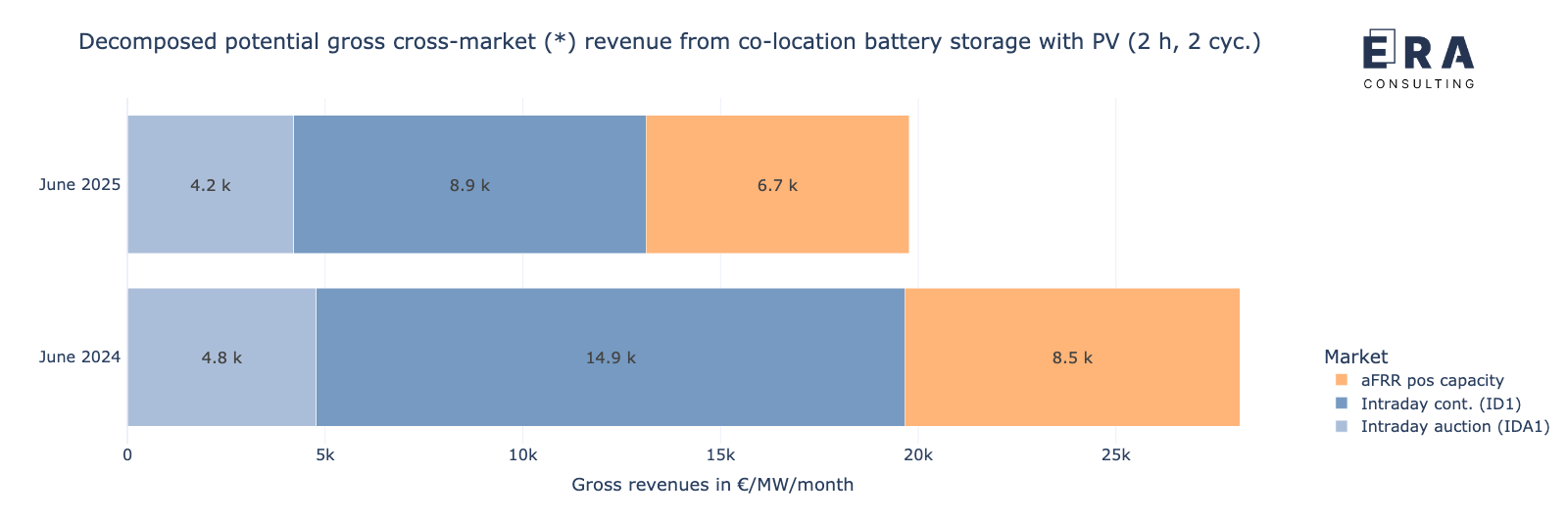 Abbildung 3: Potenzielle Bruttoerlöse des Speichers in co-location mit Windenergie durch die cross-market-Strategie im Juni 2025 und im Juni 2024, nach Einzelmärkten aufgelöst [* durchschnittliche aFRR-Leistungspreise]