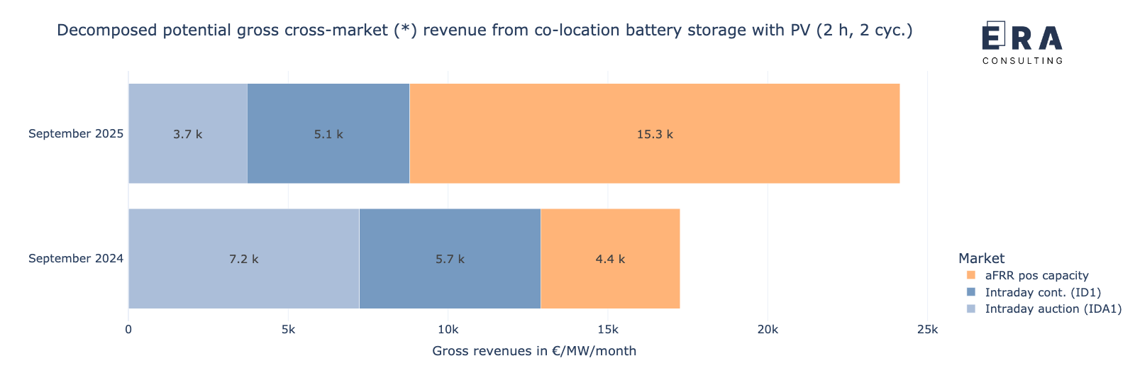 Abbildung 3: Potenzielle Bruttoerlöse des Speichers in co-location mit Windenergie durch die cross-market-Strategie im September 2025 und im September 2024, nach Einzelmärkten aufgelöst [* durchschnittliche aFRR-Leistungspreise]